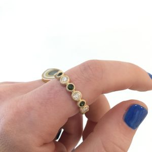 Our client wanted to make a stackable ring incorporating her new little one’s birthstone. We settled on an eternity band that would stack well with another band that she wore every day. Taking the details of the existing band, we designed a larger bezel-set alternating diamond and green tourmaline band in matte gold band with a interesting milligrain detail. The diamonds are larger than the tourmaline in the ring giving it another interesting detail for the eye. The two rings looked like they belonged together but we loved how they are different and do not match perfectly (sorry we didn’t get a picture of the rings together – trust us it was good). Can you say #futureheirlooms? Our favorite part is that the whole family was there to pick up the ring and they all approved – it was such a treat to work on such a special project.