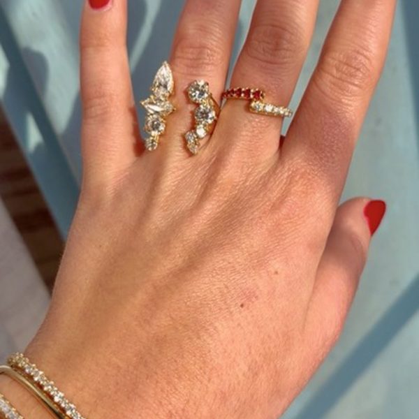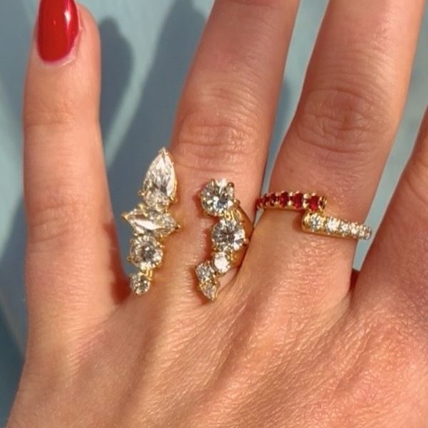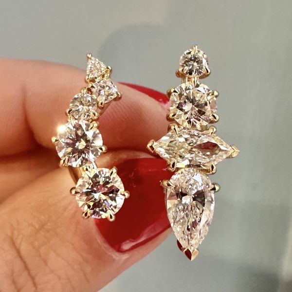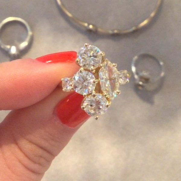 We carefully evaluated the existing ring and collaborated with our client to explore styles that would enhance its beauty. After thoughtful discussions and design renderings, we landed on a stunning arrangement featuring a mix of round, marquise, and pear-shaped diamonds, all set in warm yellow gold. The updated design showcases the heirloom diamonds in a fresh, asymmetrical layout that’s both elegant and modern. The mix of shapes adds a dynamic touch, while the delicate gold setting lets the diamonds shine.