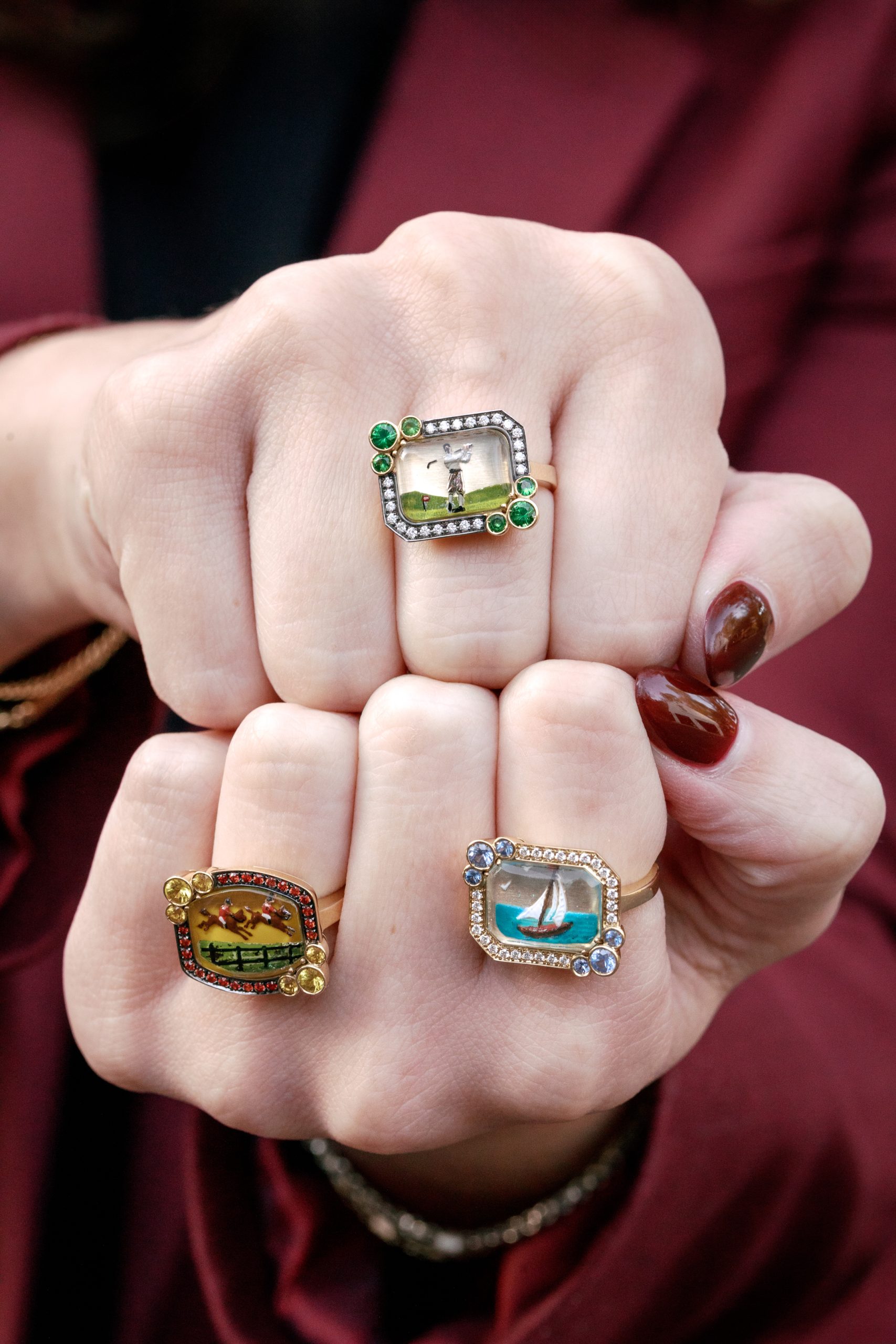 Glory Days Horse Race Ring with Orange & Yellow Sapphires Enamel Vintage Essex Crysstal Ring