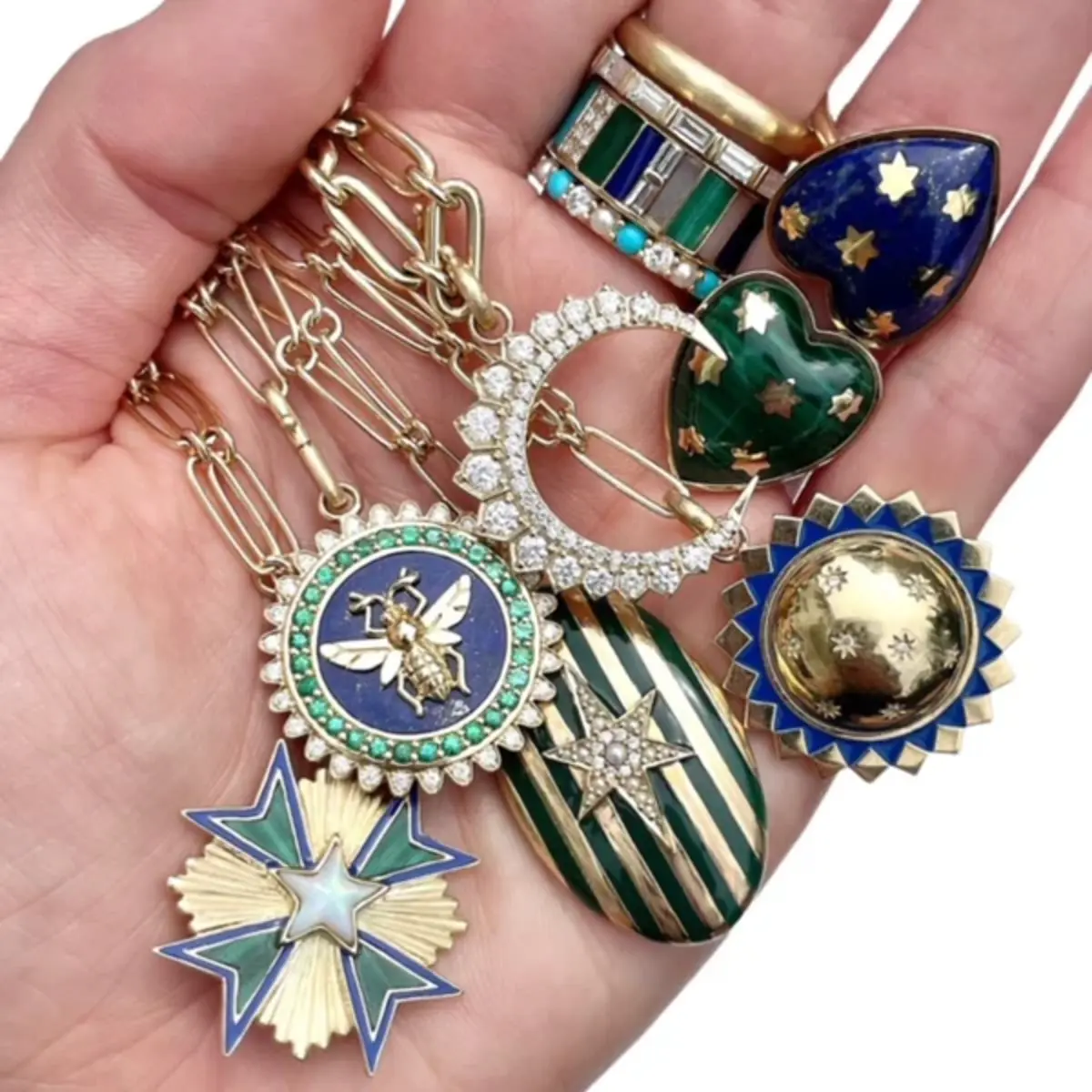 Composition: 14K Yellow Gold, Dark Blue Sapphire Pave Closure: Clip-On Bail Mechanism Measurements: Charm only, 3/4″ Length x 1″ Width