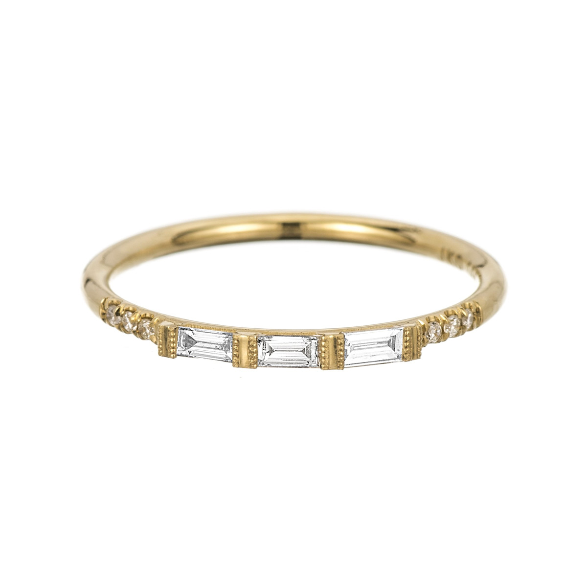 This elegant piece brings art deco style to the classic equilibrium designs. We absolutely love the marriage of these precise baguette diamonds with the balanced set design of signature JKD equilibrium styles. With a sprinkle of fine milgrain detail to give it that JKD feel, it is perfect on its own as a subtle statement piece or alternative wedding band.