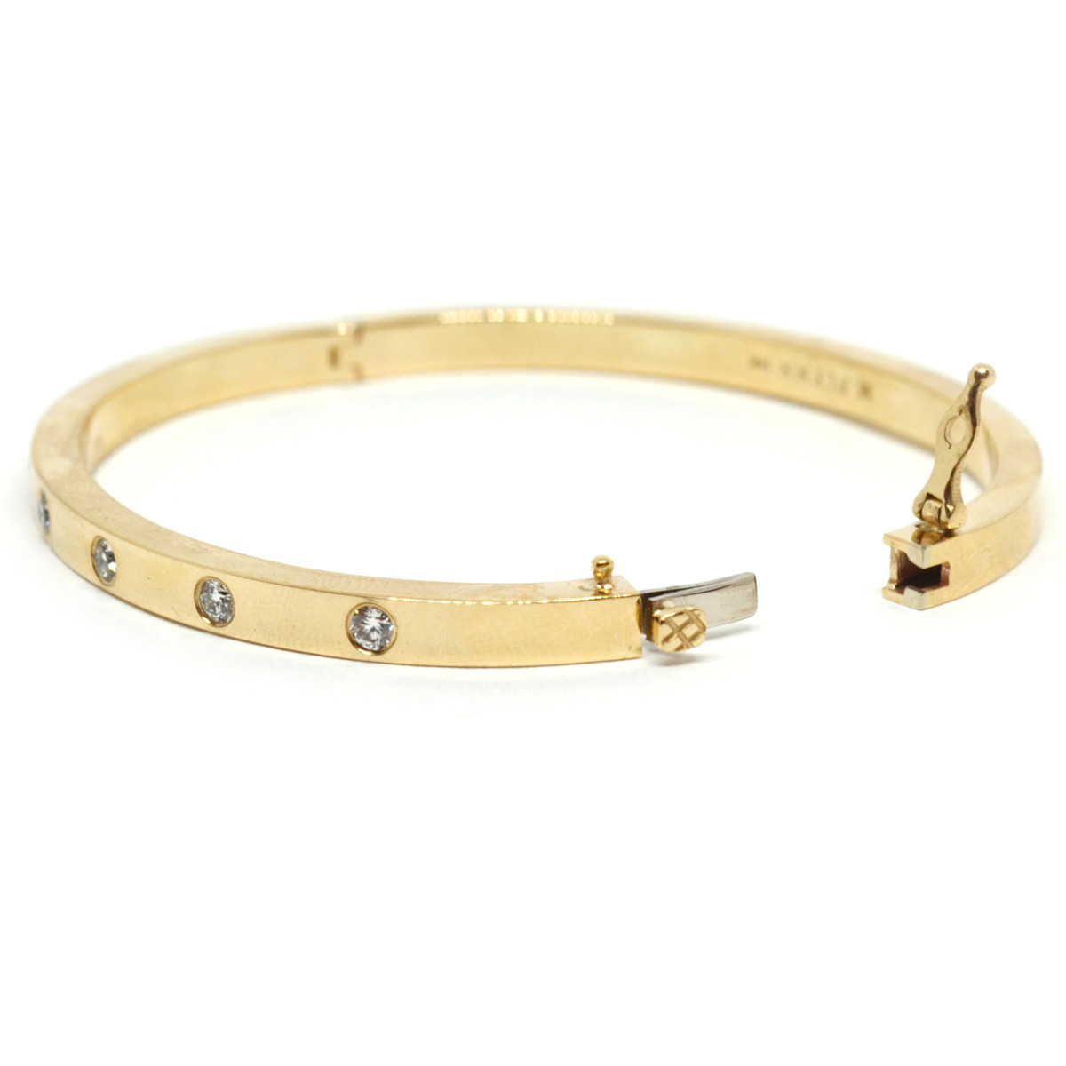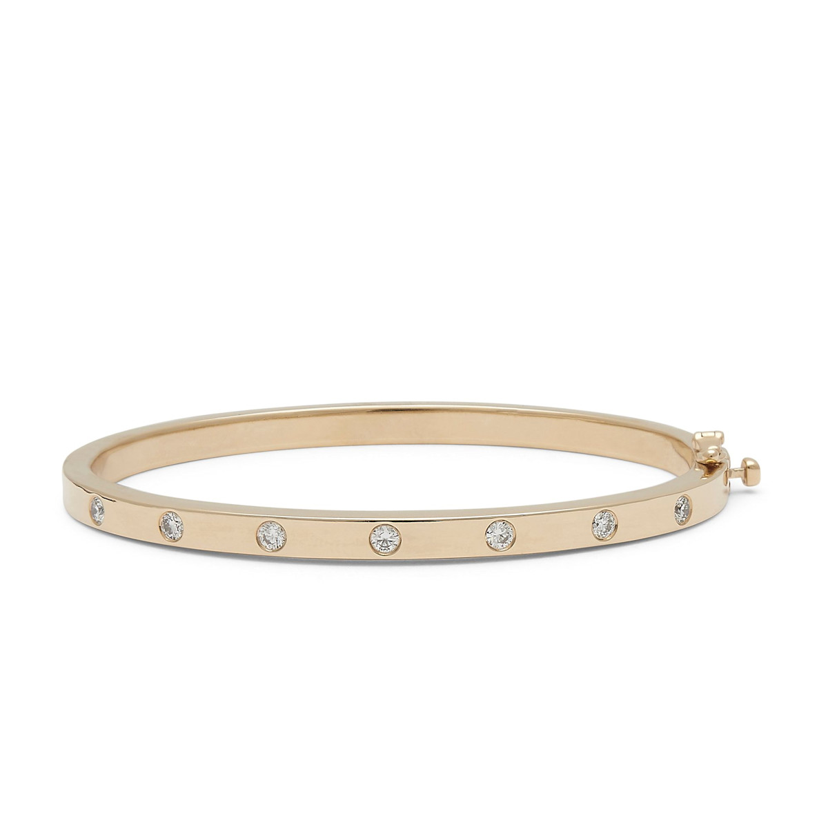 The 7 Diamond Les Points Bangle Bracelet is our latest addition to The GATES Collection by M. Flynn. This hinged bangle features 7 diamonds and is available in 14K yellow, white, and rose gold.