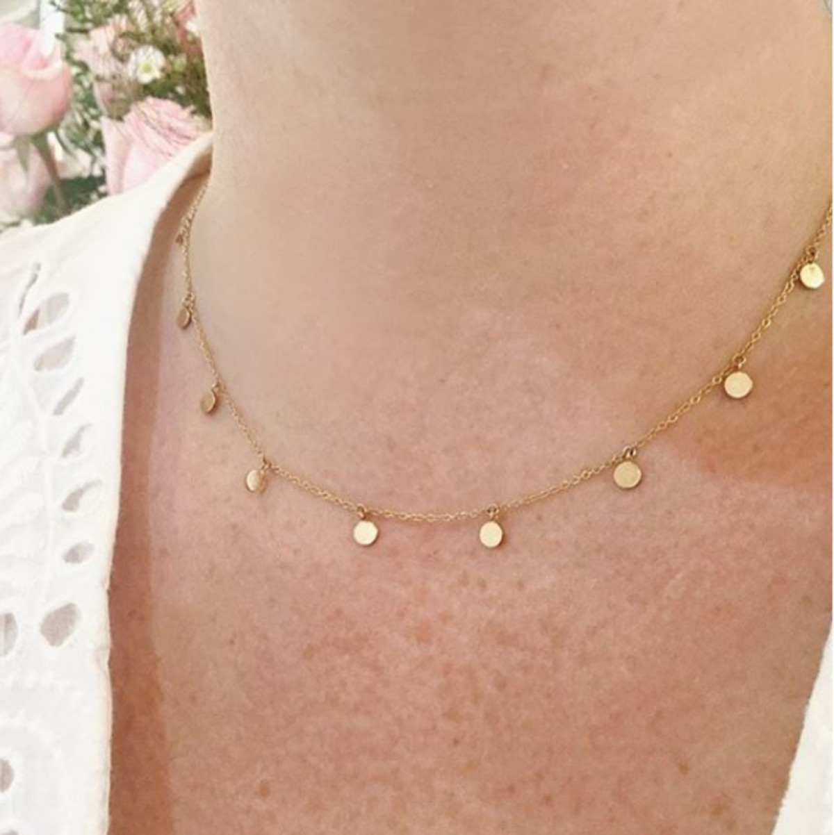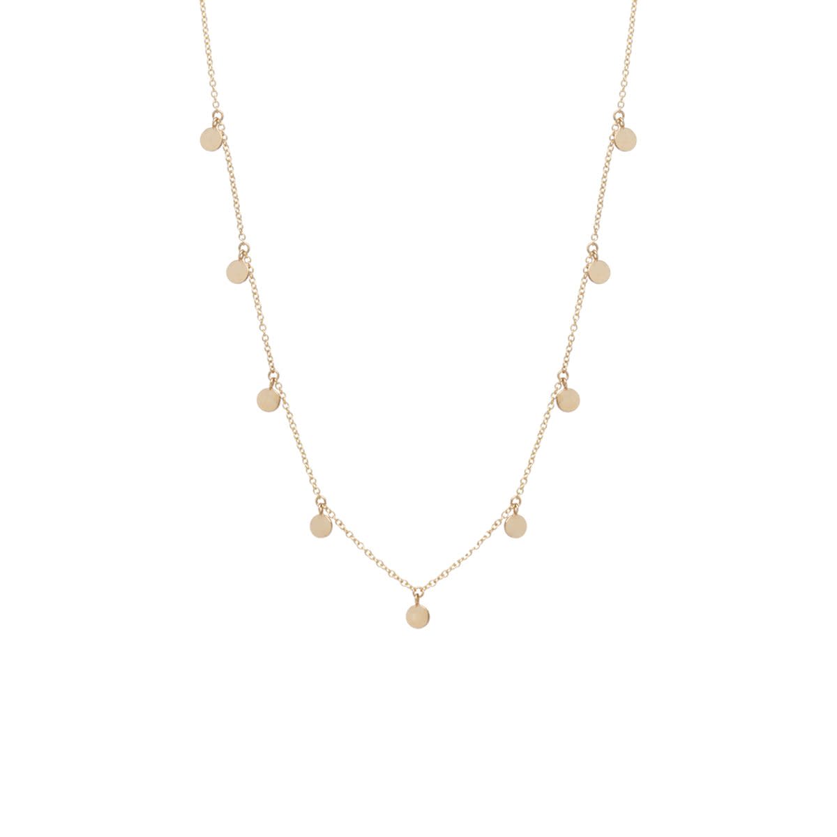 14k gold 9 itty bitty round disc charm necklace with an adjustable length chain