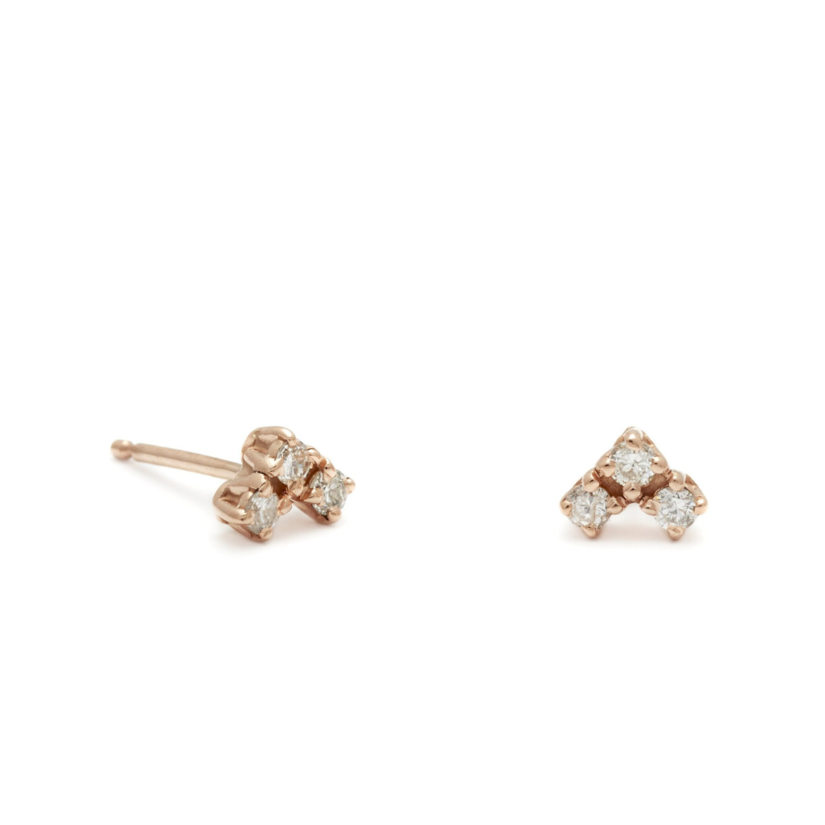 Emulating the fletching of the arrow, these dainty studs are made of three clustered white diamonds in warm yellow gold shaped baskets with post backs.
