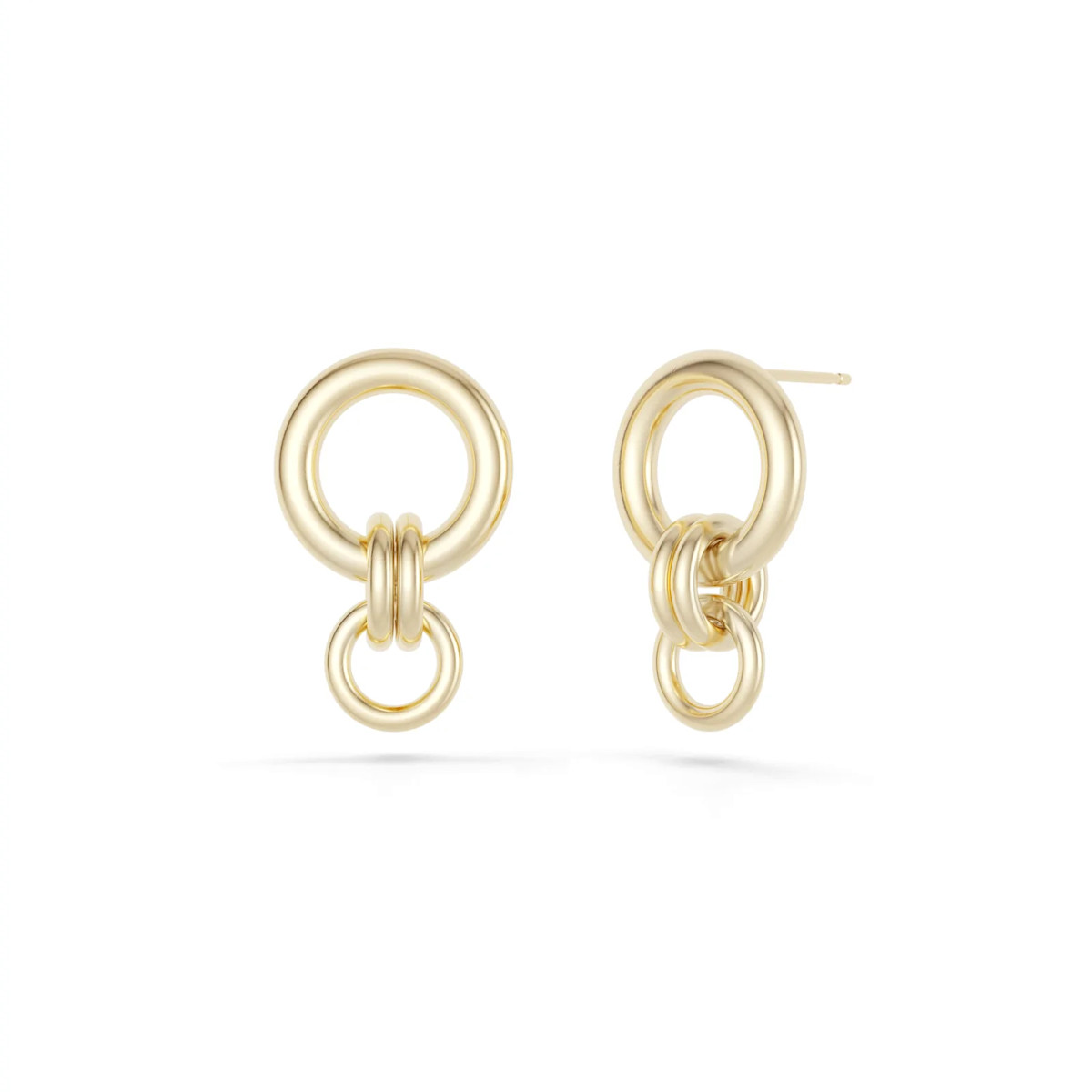 Pair of 18k yellow gold 3 link earrings with gold annulets, 18k post and comfort push back