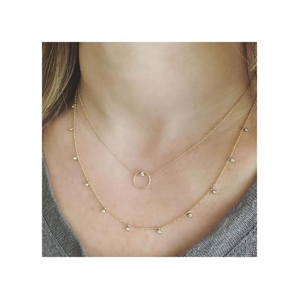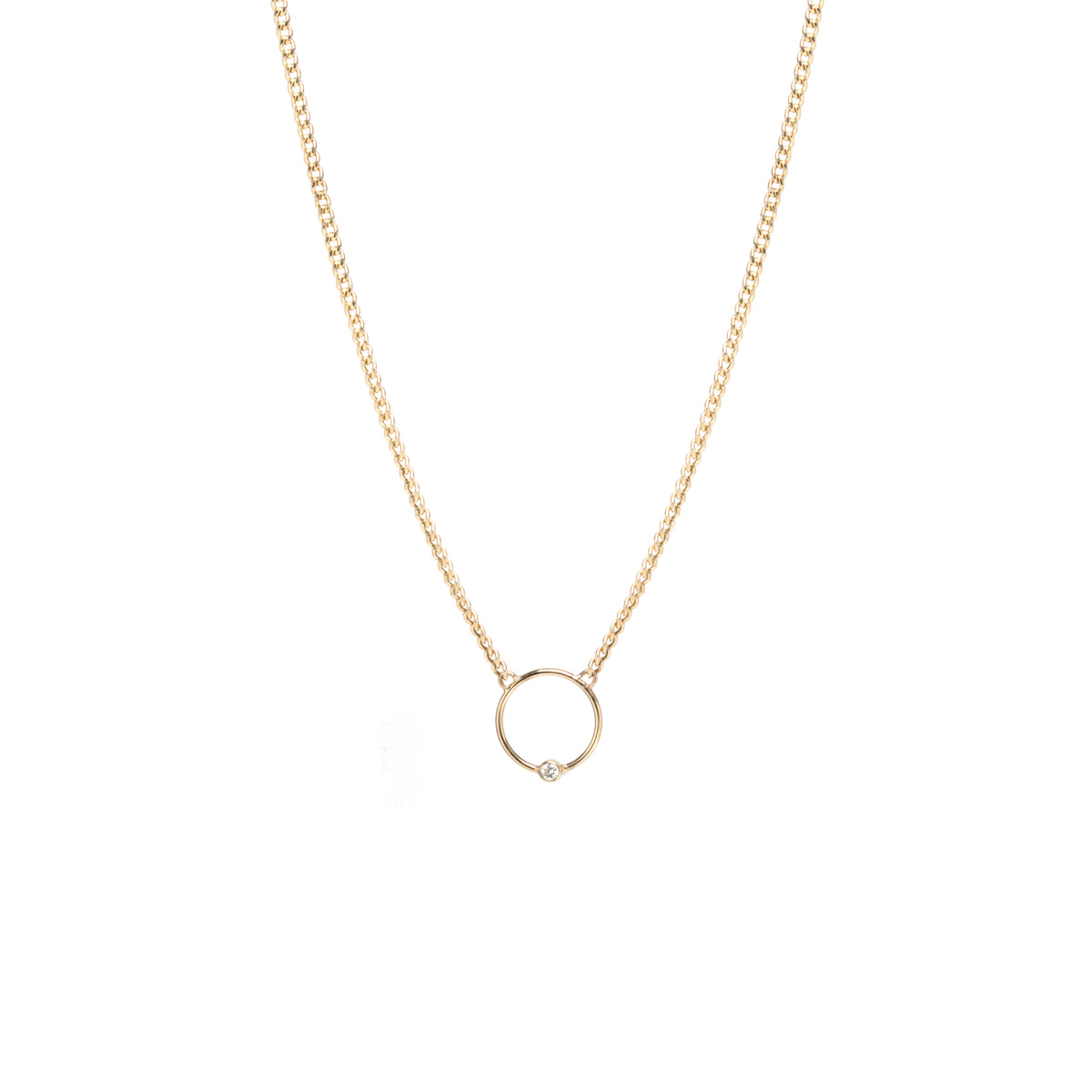 This circle pendant with a bezel set diamond on a curb chain by Zoe Chicco is the perfect layering necklace to add gold and a touch of sparkle to your neck!