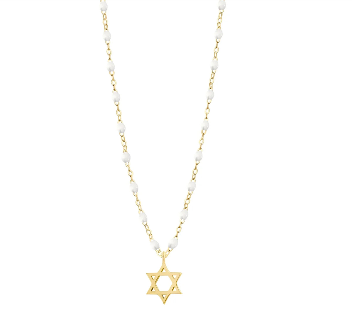This Star of David Gigi necklace in white is handmade in the south of France and has a length of 16.5 inches, adjustable to 6.1 inches. It’s an easy fit wherever you go, worn as a single strand or layered.