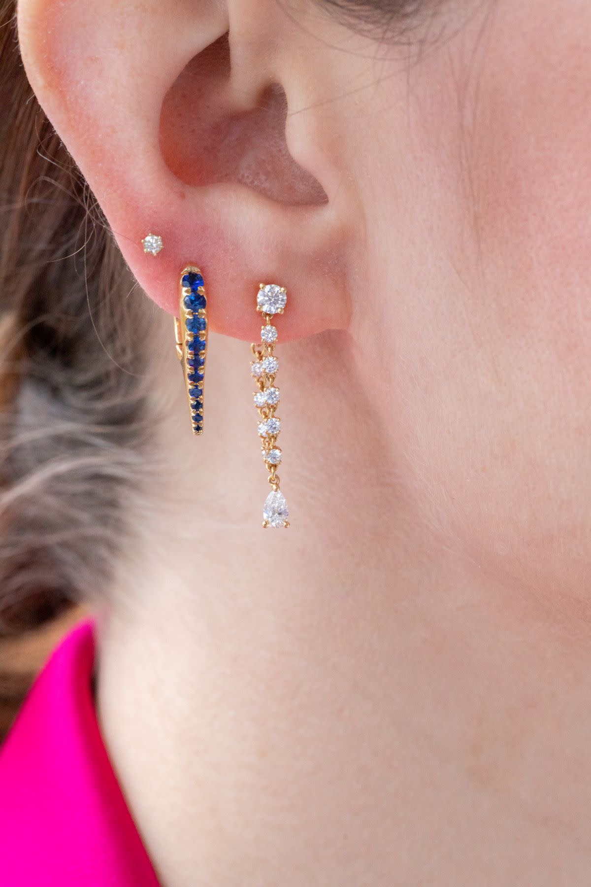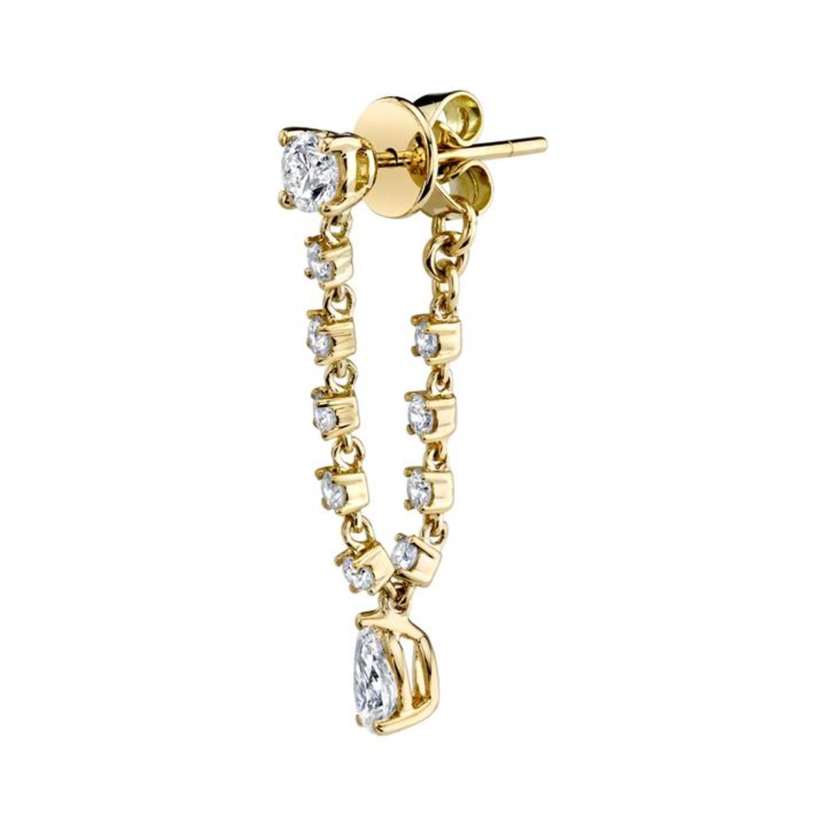 The Diamond Olivia Loop Earring by Anita Ko features a string of diamonds that loop from the front to the back of the ear for maximum front facing diamonds. Bonus diamond power is added with a pear diamond drop that catches the light beautifully as it dangles.