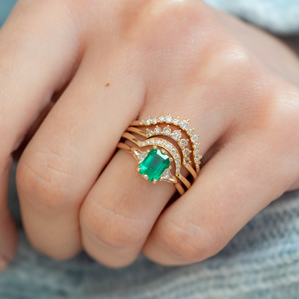 The Bea Three Stone ring features a stunning 6.8 x 5 emerald cut emerald which is set in an Anna Sheffield Jewelry signature basket – 10 prongs of mixed flat and delicate round. Inverted set trillion diamonds on each side lead the eye from the perfectly proportioned center to the subtly knife edge band.