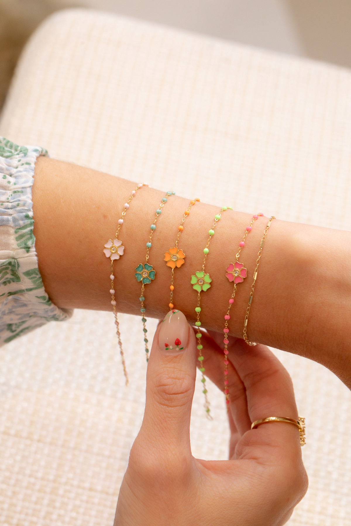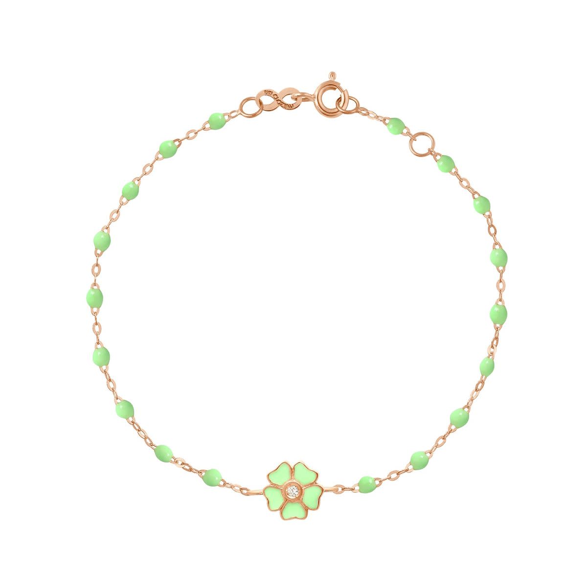 The Classic Gigi Flower Bracelet by Gigi Clozeau Features Anis Green Resin Pearls with a Subtle Diamond in the Center of the Flower.
