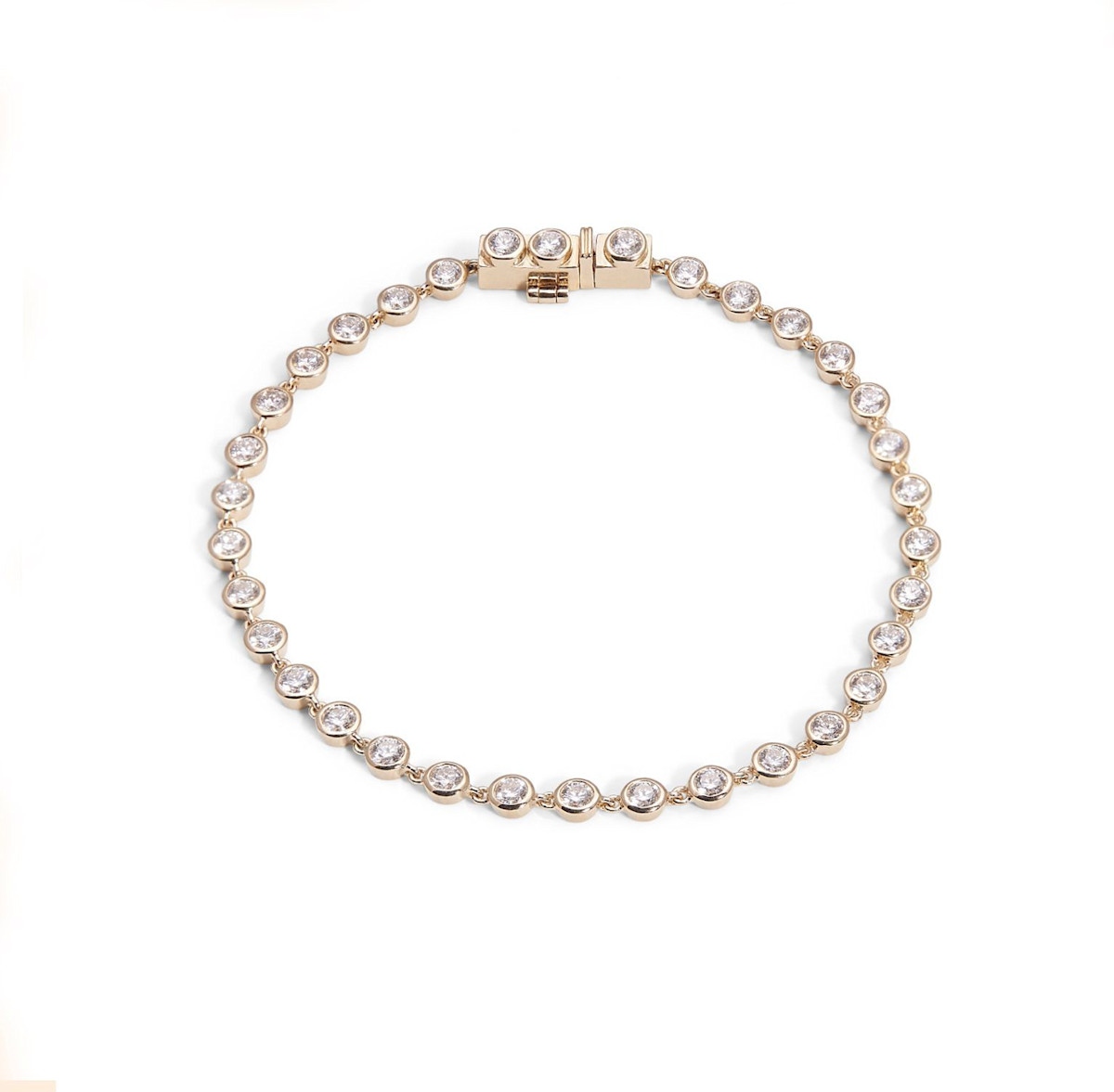 Timeless elegance meets modern sophistication in the Gates Bezel Tennis Bracelet 2.05 TCW. This stunning bracelet features 2.05 total carats of brilliant diamonds, each meticulously set in individual bezel settings for a sleek and refined look. Crafted from premium materials, the bracelet delivers both style and comfort, making it perfect for everyday wear or special occasions. Its classic design ensures it’s a versatile addition to any jewelry collection, radiating sophistication with every movement.