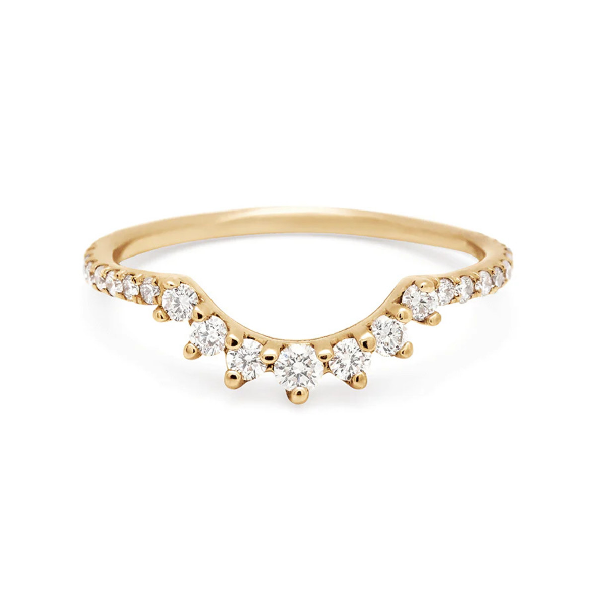 The Grand Tiara Pave Band from Anna Sheffield features a curved round diamond tiara and pave diamonds that continue down the band for maximum sparkle. This ring looks beautiful stacked with your round brilliant engagement ring for seamless style!