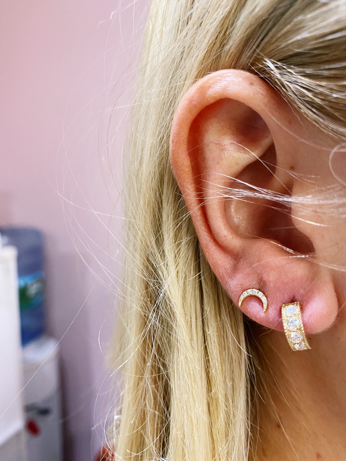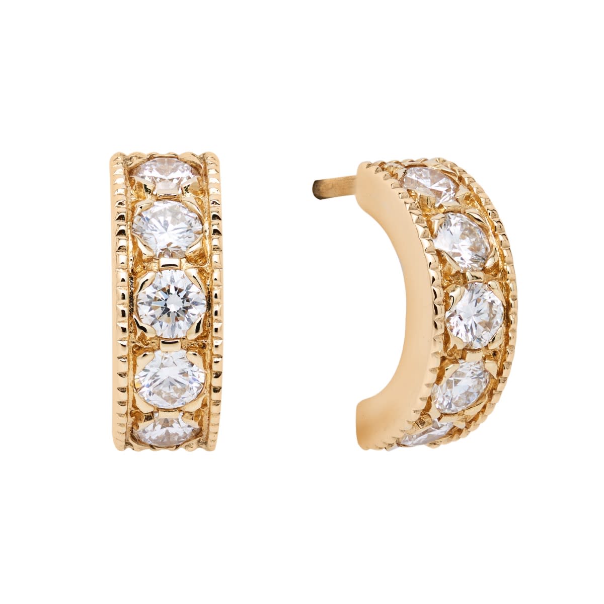 The Heirloom Huggies from The GATES Collection by M. Flynn features 5 full-cut diamonds per earring, set in 14k yellow gold.