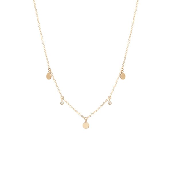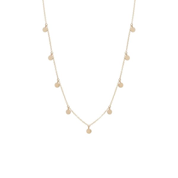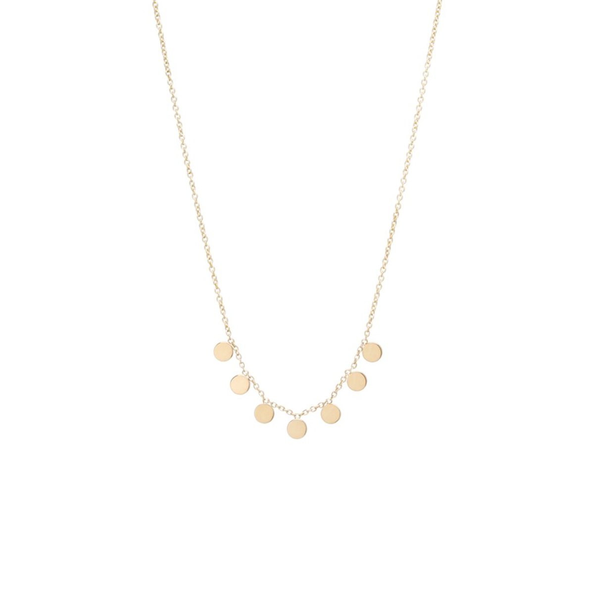 14k gold necklace with 7 itty bitty round discs attached underneath the chain