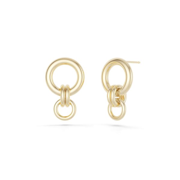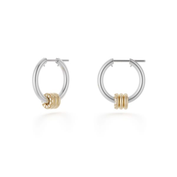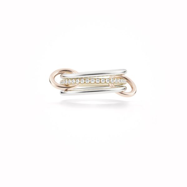 3 linked rings in sterling silver with black rhodium plating, micropave grey diamonds and yellow gold connectors. Size 8 is typically in stock, text us to special order and with questions 617-292-0079.