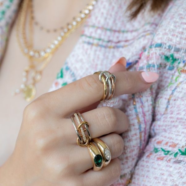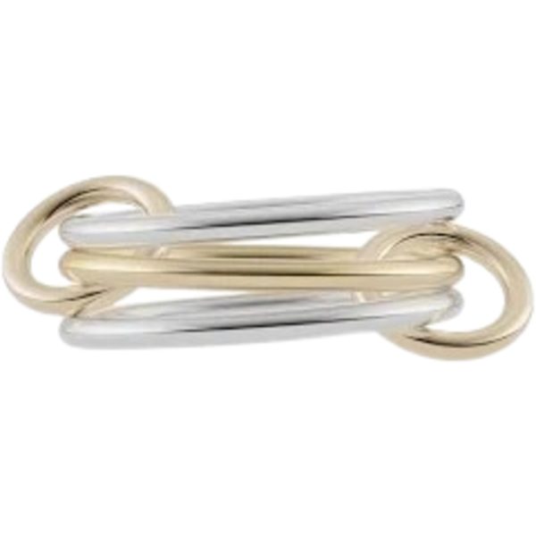 3 linked rings in sterling silver with black rhodium plating, micropave grey diamonds and yellow gold connectors. Size 8 is typically in stock, text us to special order and with questions 617-292-0079.