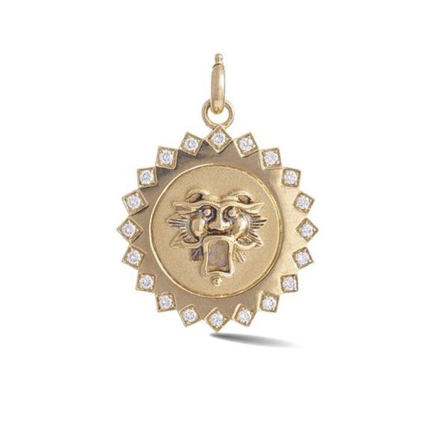 The diamond guardian lion medallion features a 14k yellow gold lion head with diamonds all the way around
