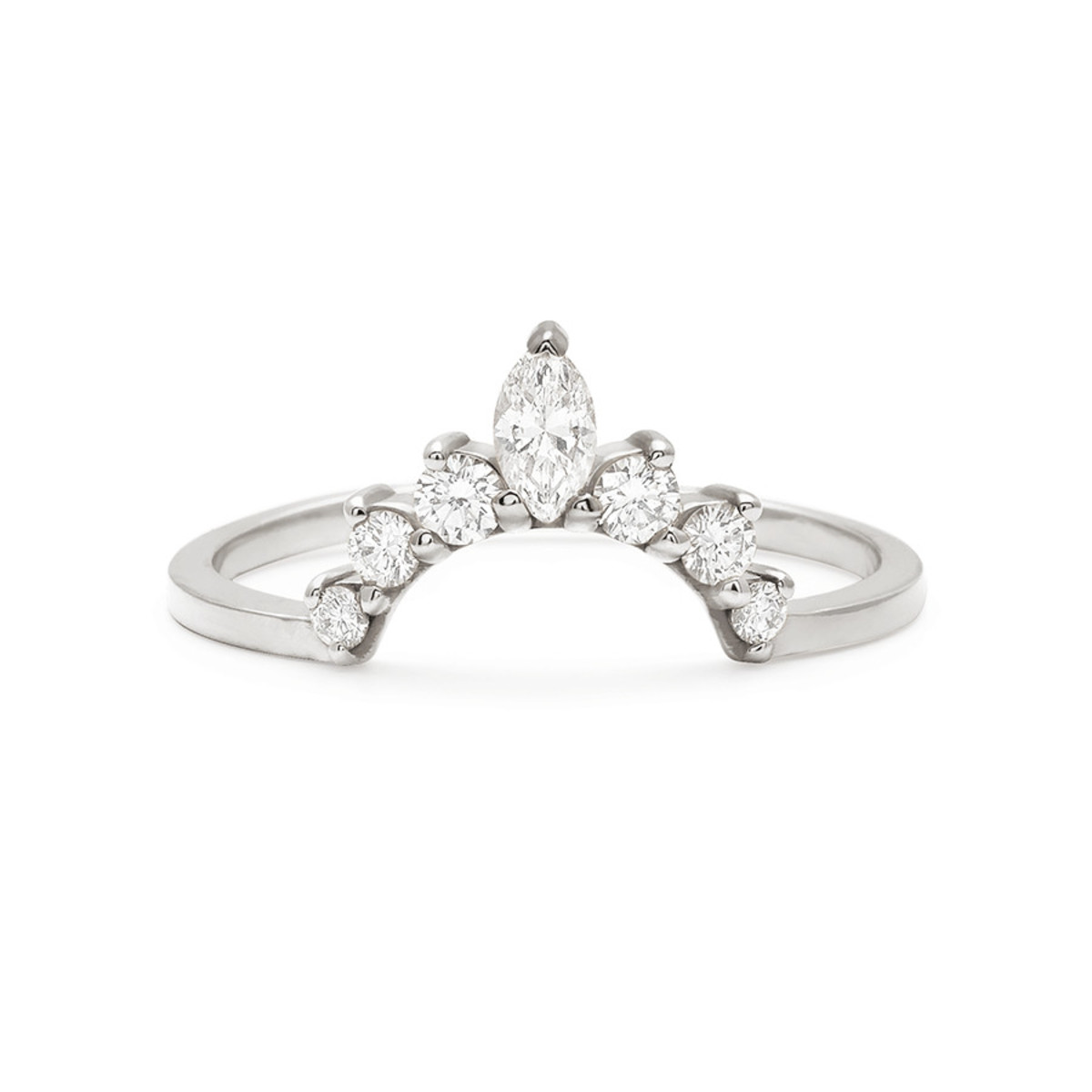 The Marquise Tiara’s crowning jewel is, in fact, its central feature – the namesake marquise shaped stone. The delicate arc is made by three graduated round diamonds at either side, making for quite the statement nesting band or the regal addition to any engagement ring- be it round, oval, emerald or pear in shape.