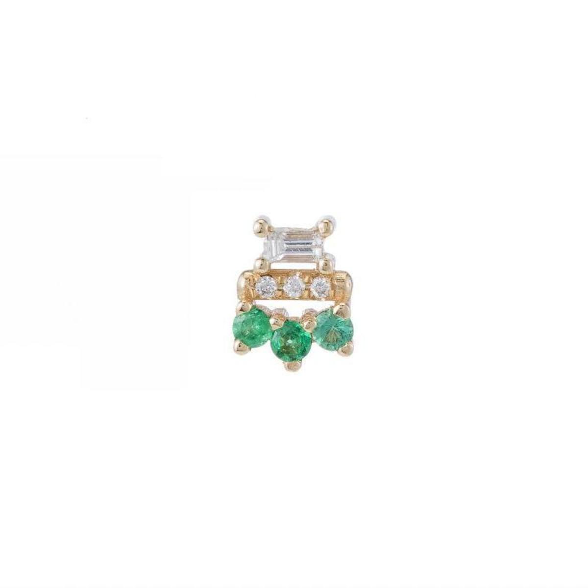 Elegant lace like details spun of emeralds, accented by a clean geometric diamond, sprinkled by a few sparkly pave diamonds.  We love how perfectly balanced this stud earring is.  Beautiful as a pair or as an addition to your earring stack.