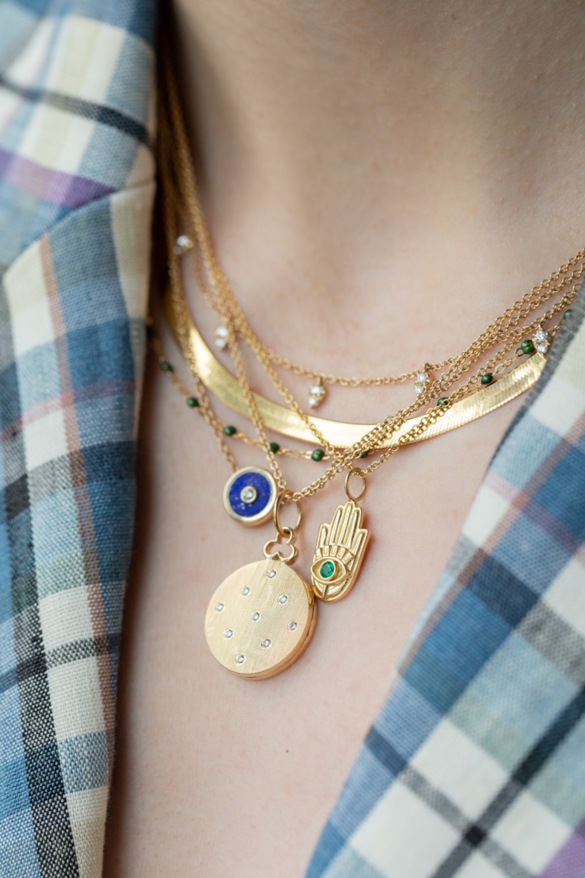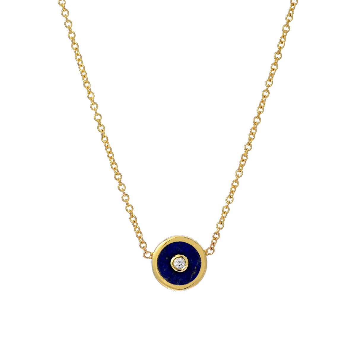 Hand cut lapis inlay, set in 14k yellow gold with 0.02ct white diamond.