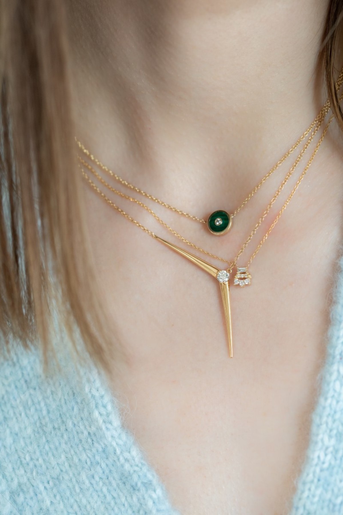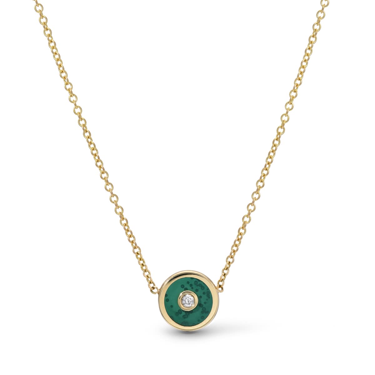 Hand cut malachite inlay, set in 14k yellow gold with 0.02ct white diamond.