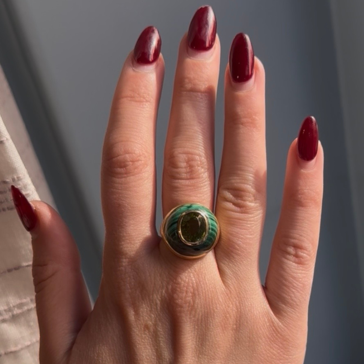 Elevate your jewelry collection with the Petite Lollipop Ring from M. Flynn. This one-of-a-kind statement ring features a vibrant 4.14ct cushion-cut green tourmaline set in richly detailed, hand-carved malachite. The striking contrast of lush green tones and masterful craftsmanship makes this piece a wearable work of art. Perfect for collectors and lovers of bold, unique fine jewelry.
