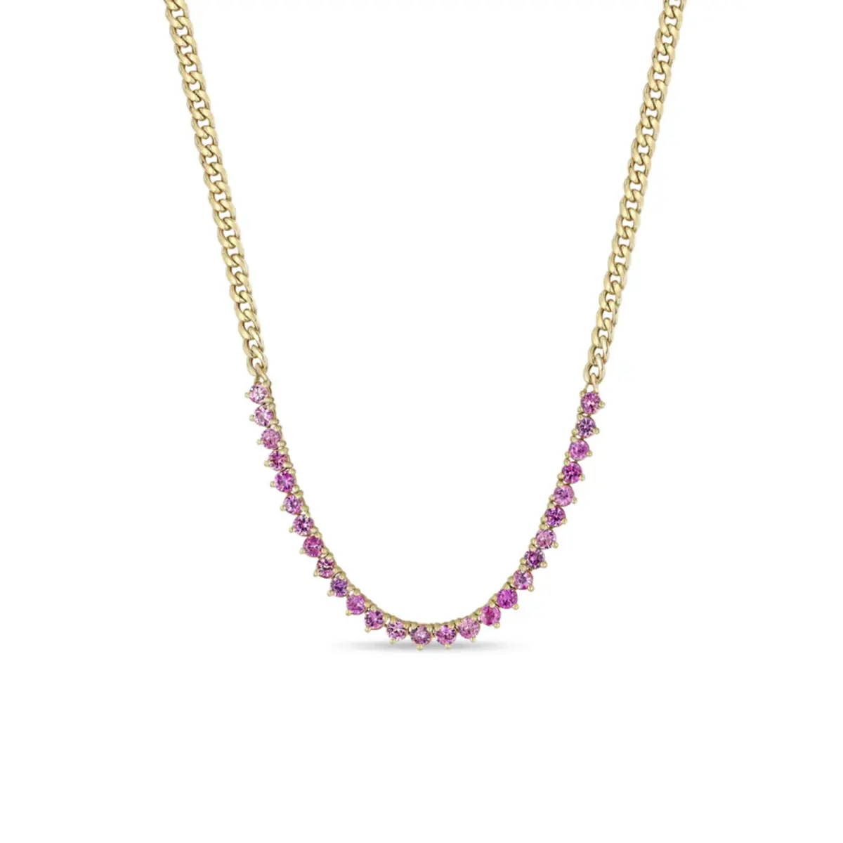 Enhance your style with our Pink Sapphire Tennis Station Small Curb Chain Necklace in 14K yellow gold. Featuring radiant pink sapphires along a sleek curb chain, this necklace is perfect for layering or wearing alone, adding a vibrant touch to any outfit.