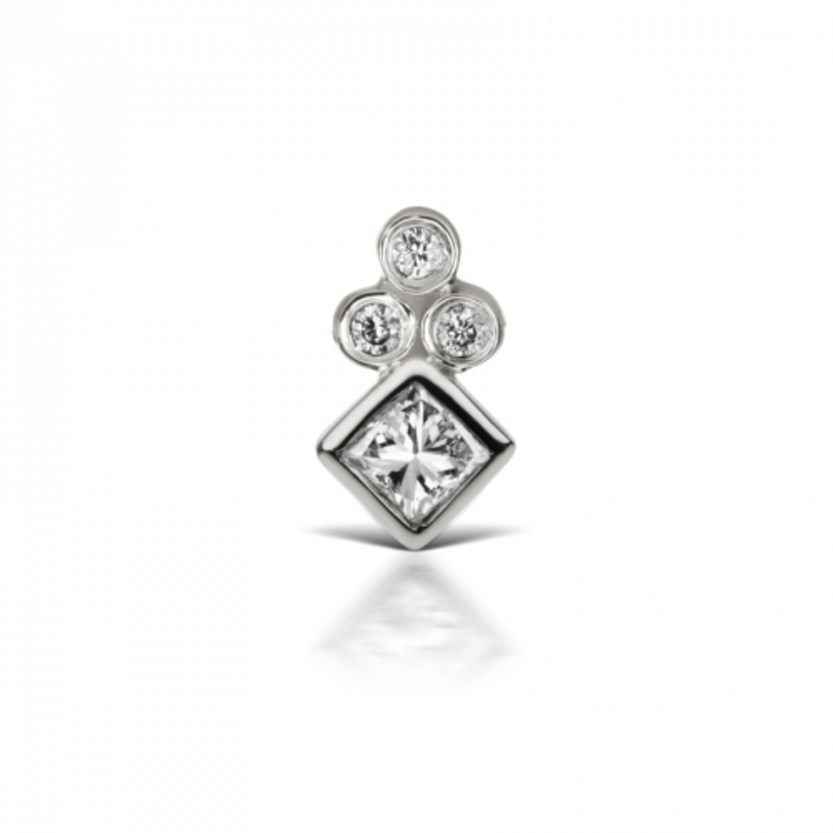 Features a princess-cut (square) diamond set in a plain bezel, accented by three smaller diamonds at the top in 14k white gold.