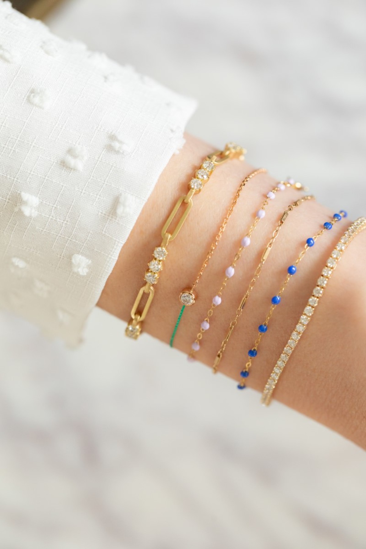 Made in Paris, the diamond on a string bracelet is a classic RedLine design. A 0.1ct diamond set in an18k yellow gold bezel that represents the contrast between the eternal glow of the diamond and the timeless radiance of the gold. The signature sheen string celebrates the infinite connection of an everlasting bond.