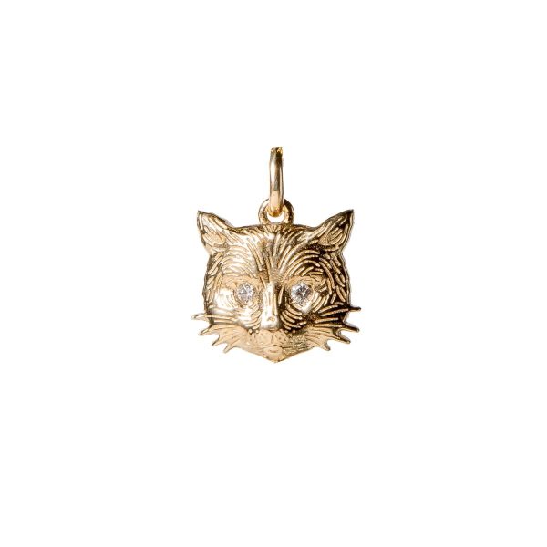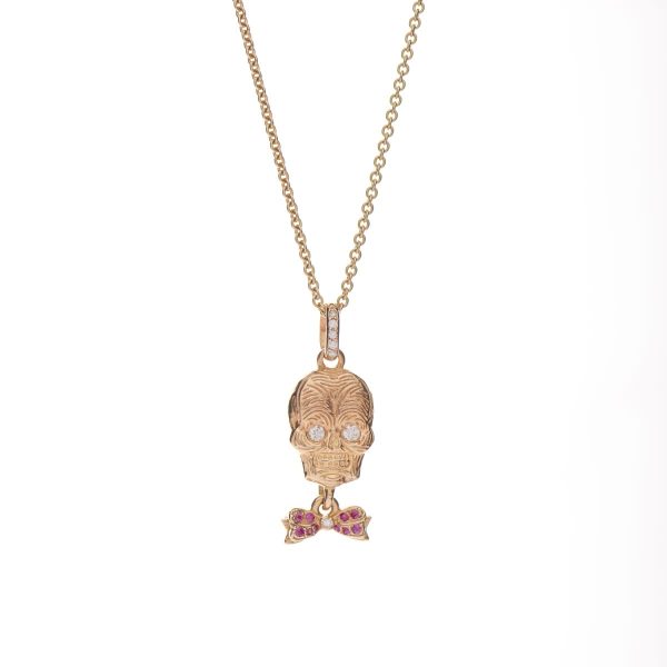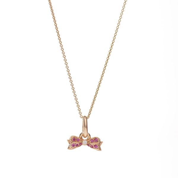 14k yellow gold with diamond pave jump ring, diamond eyes, and rubies single diamond bow available on an 18” or 24” chain 9 g 15.11 x 20.6 mm chain sold separatelyPlease allow 4-6 weeks for products that are back-or...