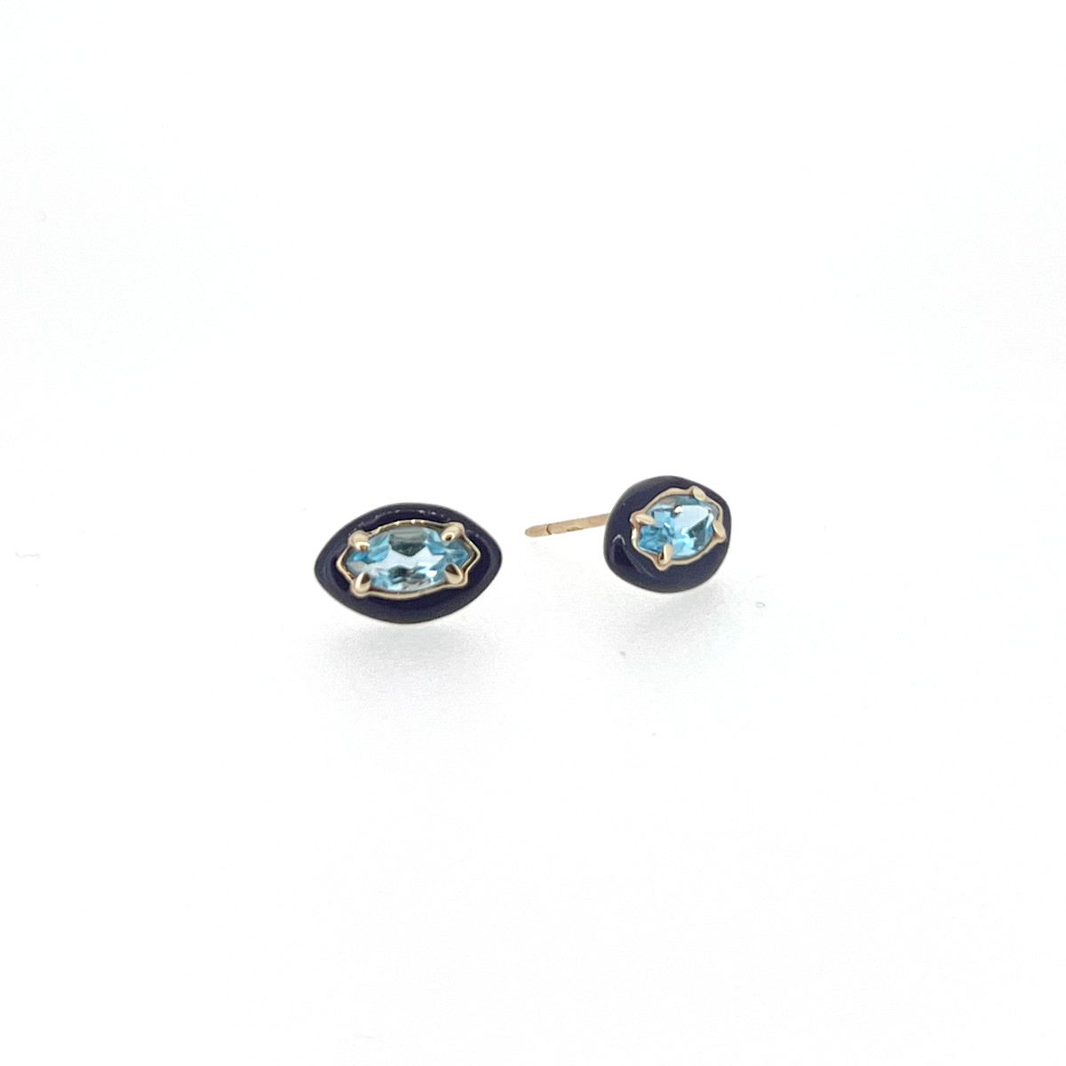Sweetness earrings, pair, with deep purple enamel, and marquise cut blue topaz