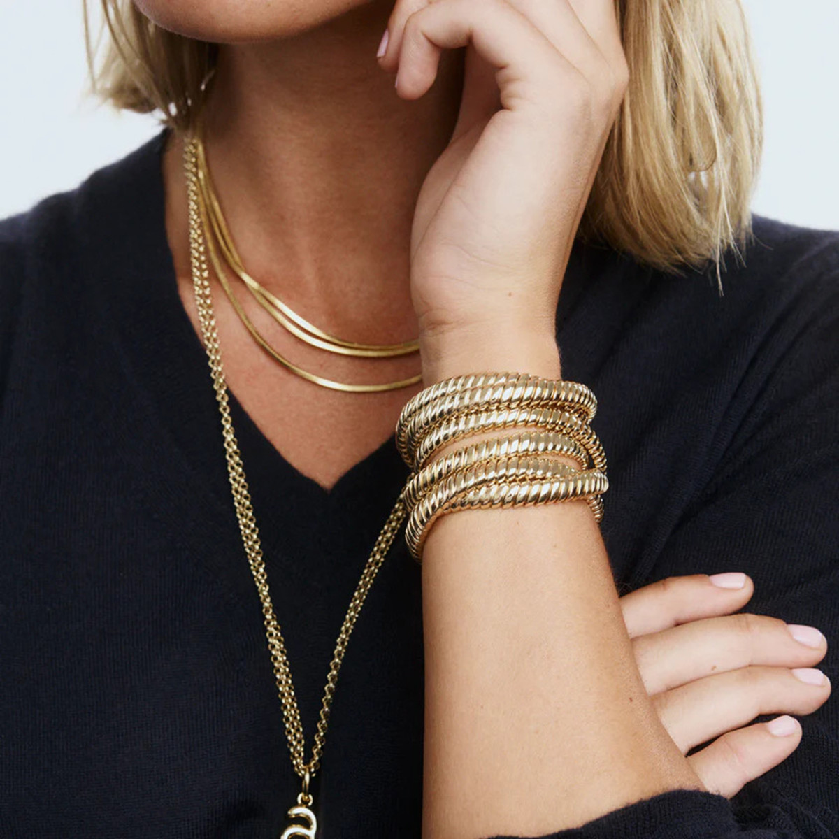 The Roxanne Assoulin Double Cobra Bracelet in Gold adds edge and shine to any wrist stack. With its flexible design and high-shine gold and silver tones, this piece is easy to wear and impossible to miss. Style it solo or layer it up—this is your new everyday go-to.