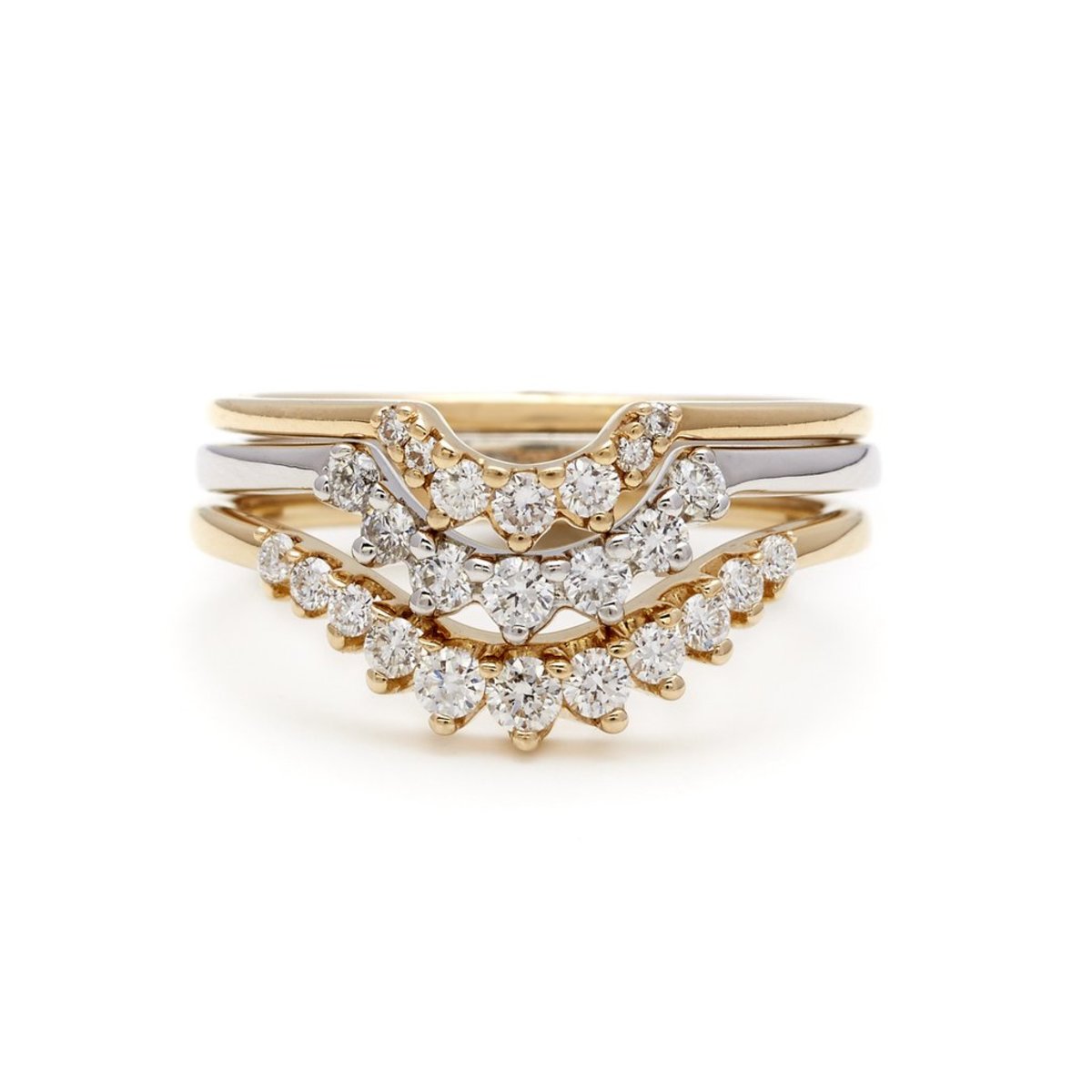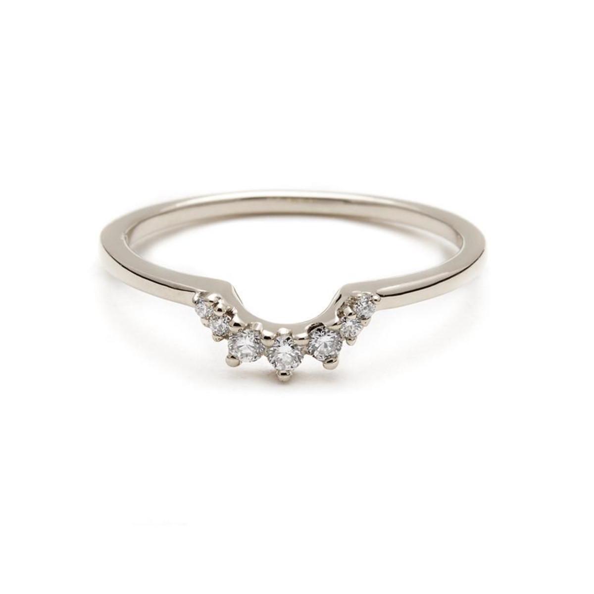 Designed to accentuate the Hazeline Solitaire and the Wheat Engagement ring, the Tiara nesting band is an exceptionally lovely piece with a cluster of five prong set white diamonds. This band can accompany the Solitaire and Wheat Engagement singly as well as on both sides in matching or contrasting metal colors and a variety of gemstones.