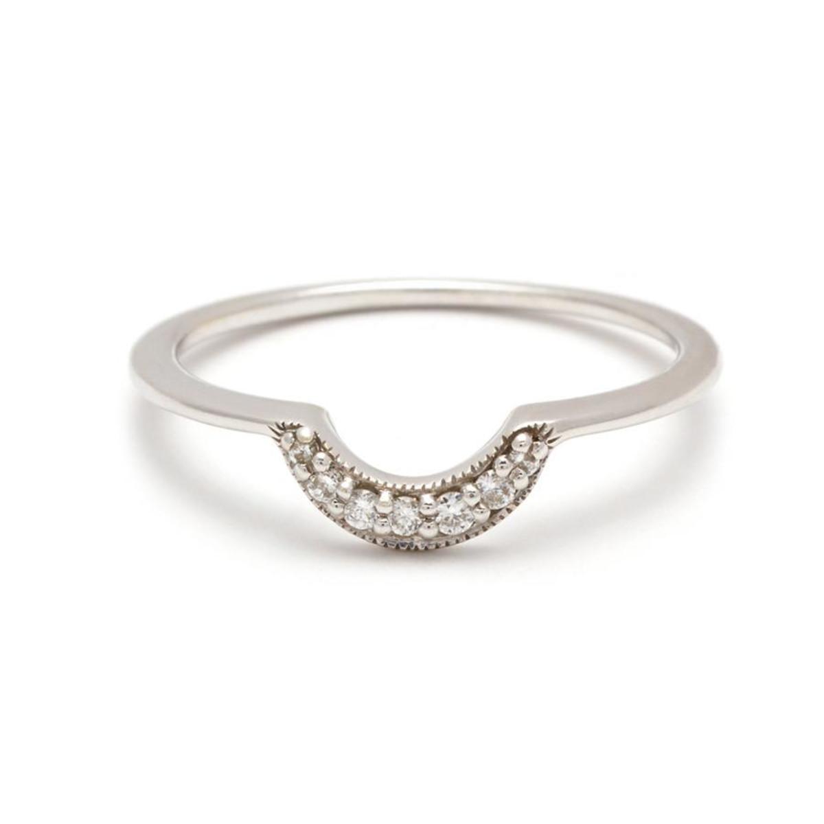 The Hazeline Crescent ring is a perfect match to the Hazeline ring. It is delicate enough to be worn alone or stacked- as well as mixed and matched with the Tiara nesting band in a variety of metal and diamond colors.