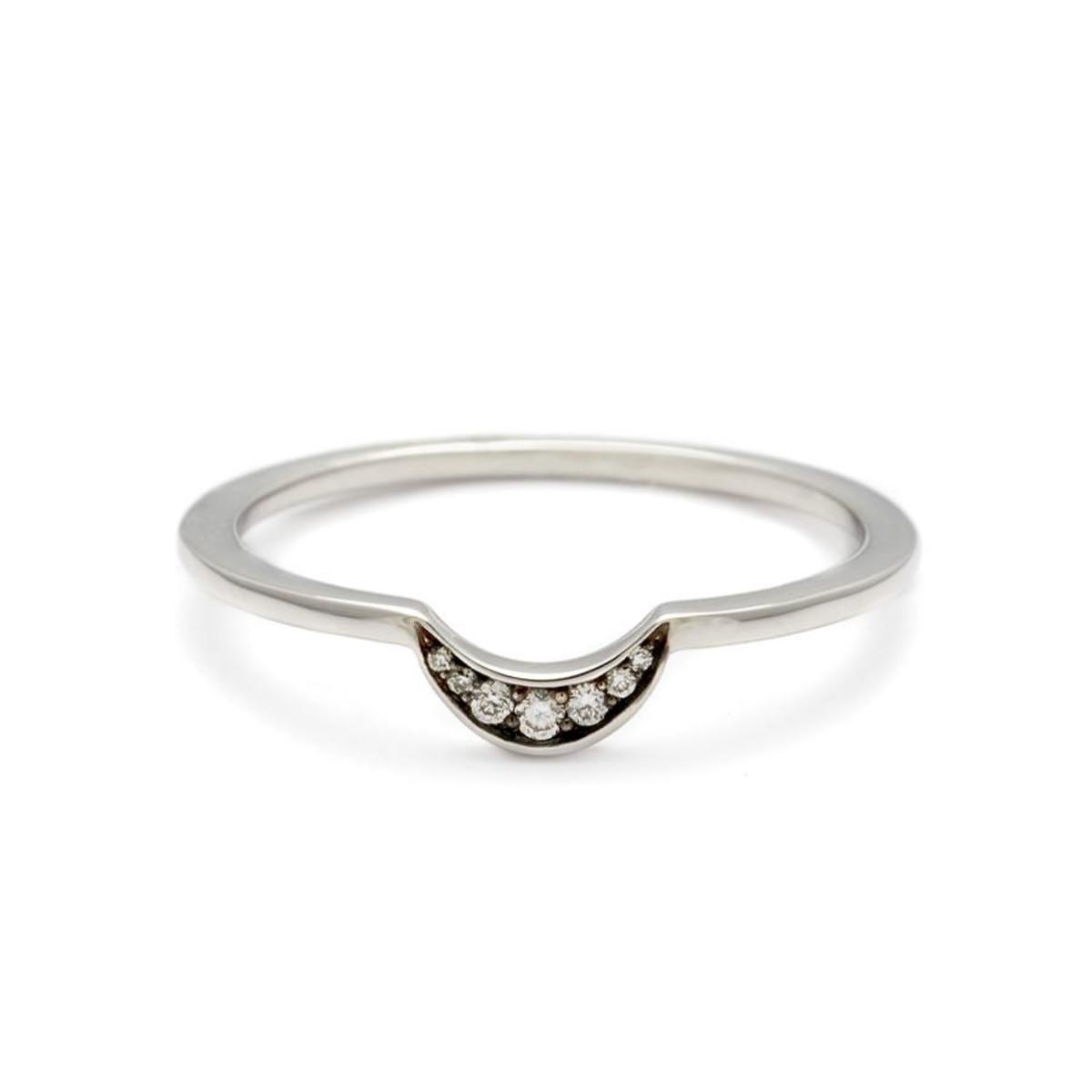 A dash of the mystical enters into our Tiny New Moon by way of the delicate, diamond dusted shape. The silhouette is a perfectly feminine reference to the sliver of light in the night sky following the new moon. These bands stack with many of our rings and lend illumination when worn layered or singularly.