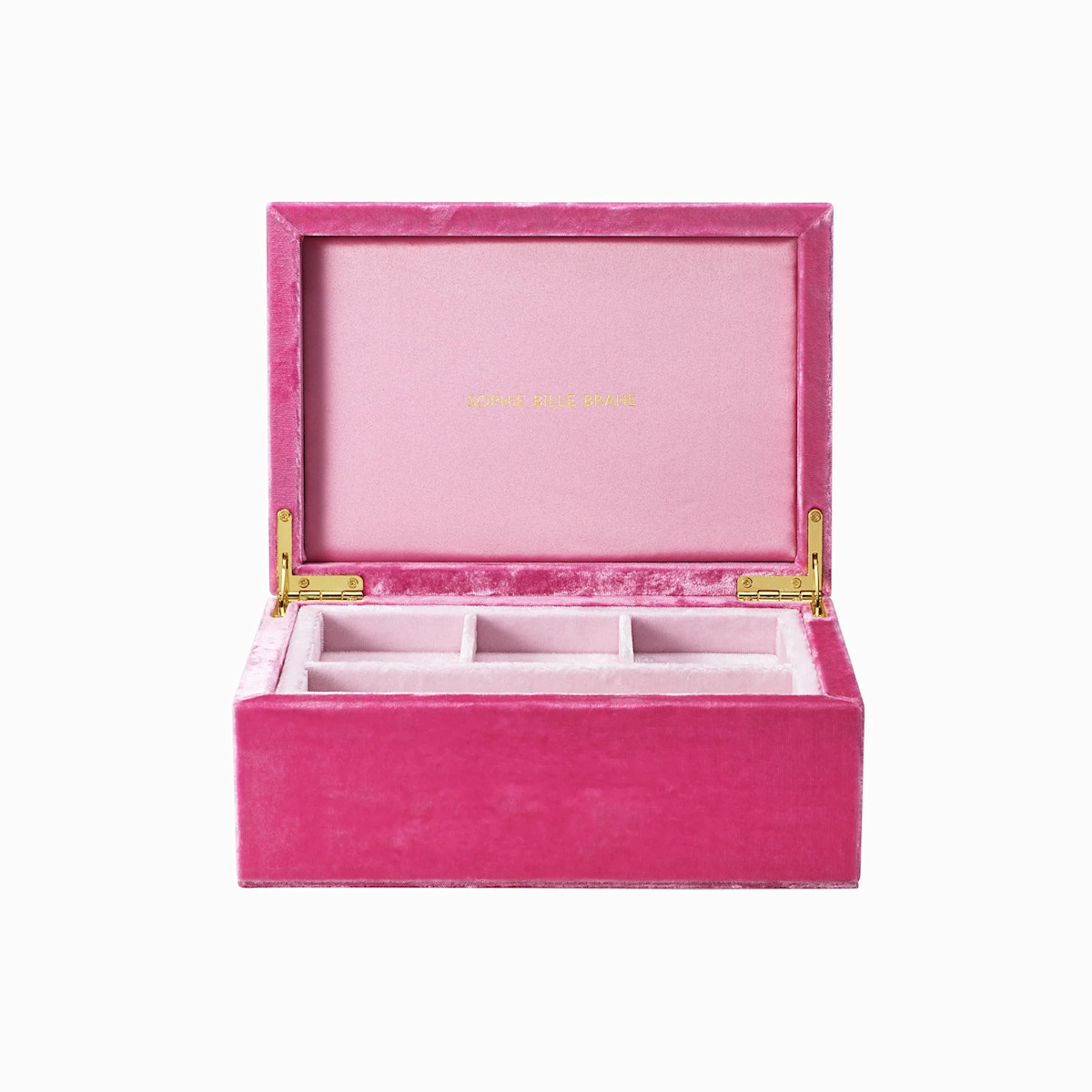 The Tresor Grande Jewelry Box from Sophie Bille Brahe features a removable top tray with 4 compartments. This box has pink plush silk velvet fabric and a rose interior.