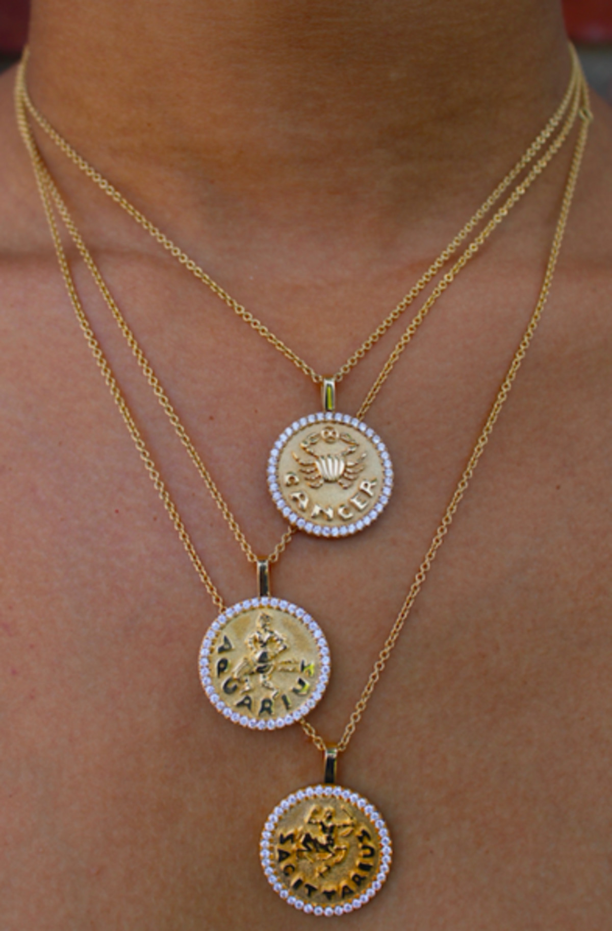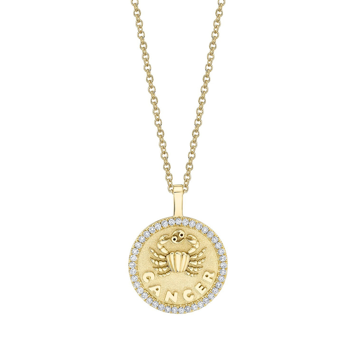 18k gold CANCER zodiac coin pendant with diamond frame.